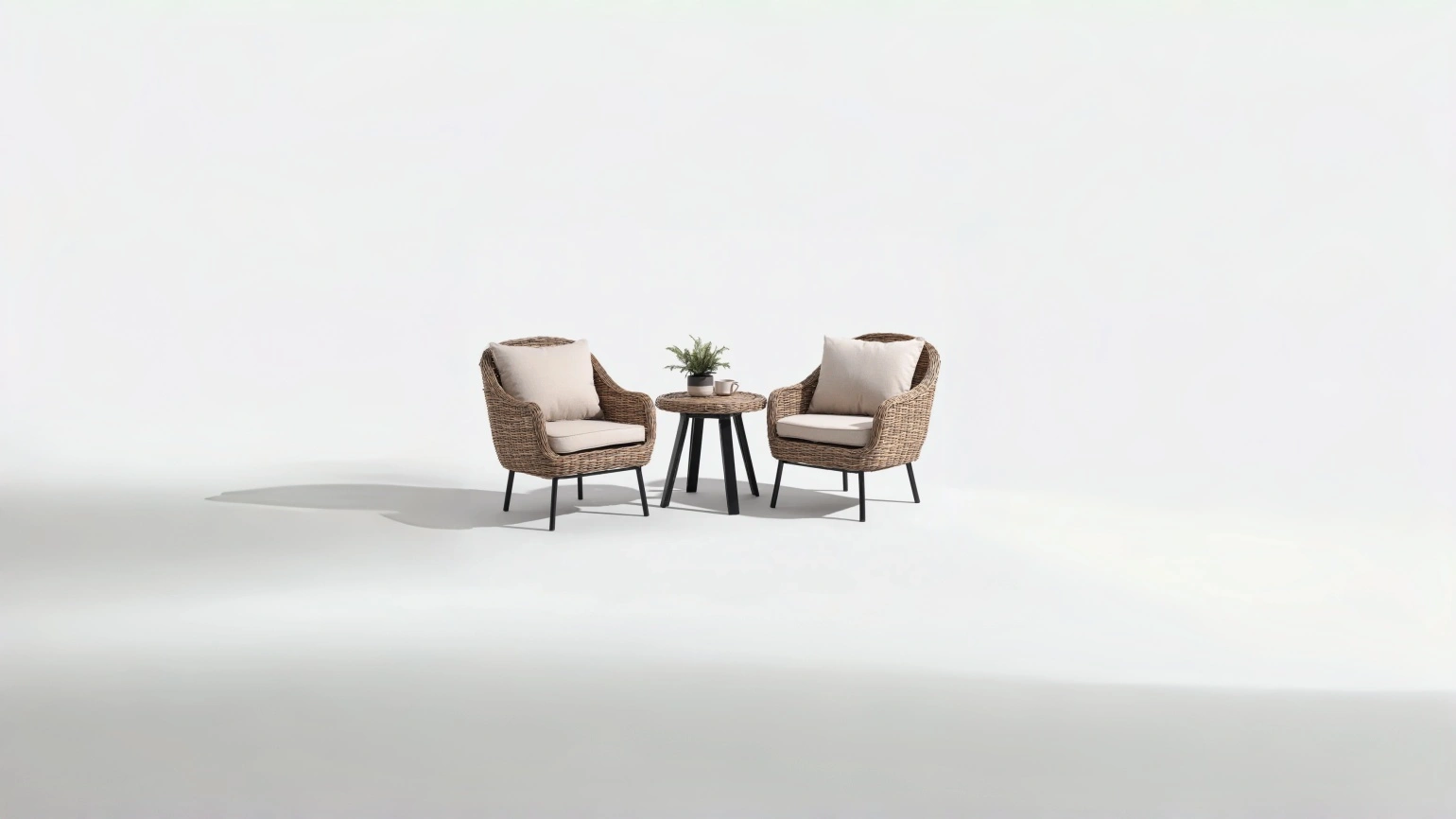 This outdoor conversation set is designed for relaxed outdoor seating, combining two woven lounge chairs with a compact round side table. The balanced proportions and natural textures make it suitable for patios, balconies, terraces, and garden seating areas.