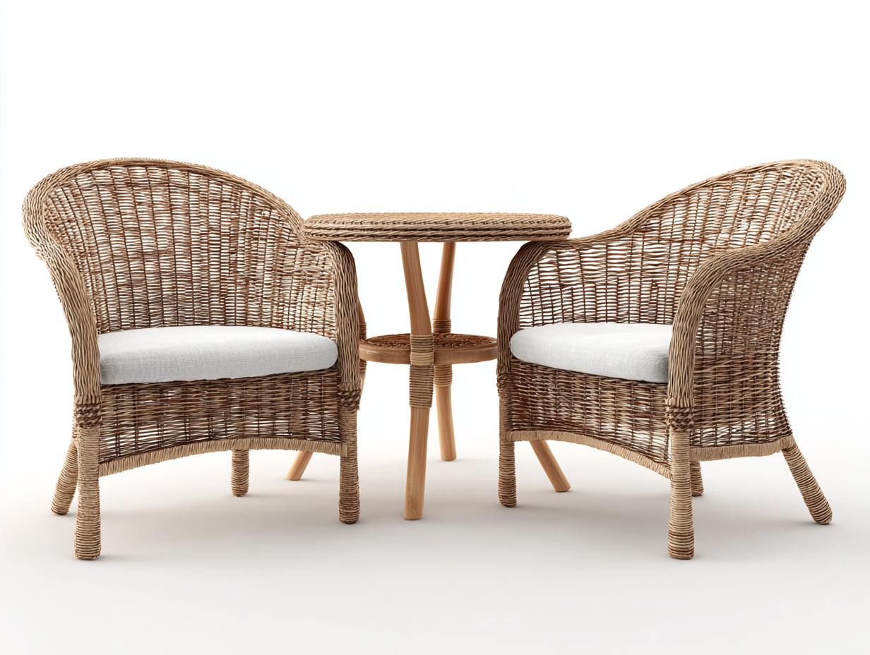 Outdoor Conversation Set wicker lounge chairs with round side table 75x70x80 cm - Natural wicker and wood - Modern outdoor design