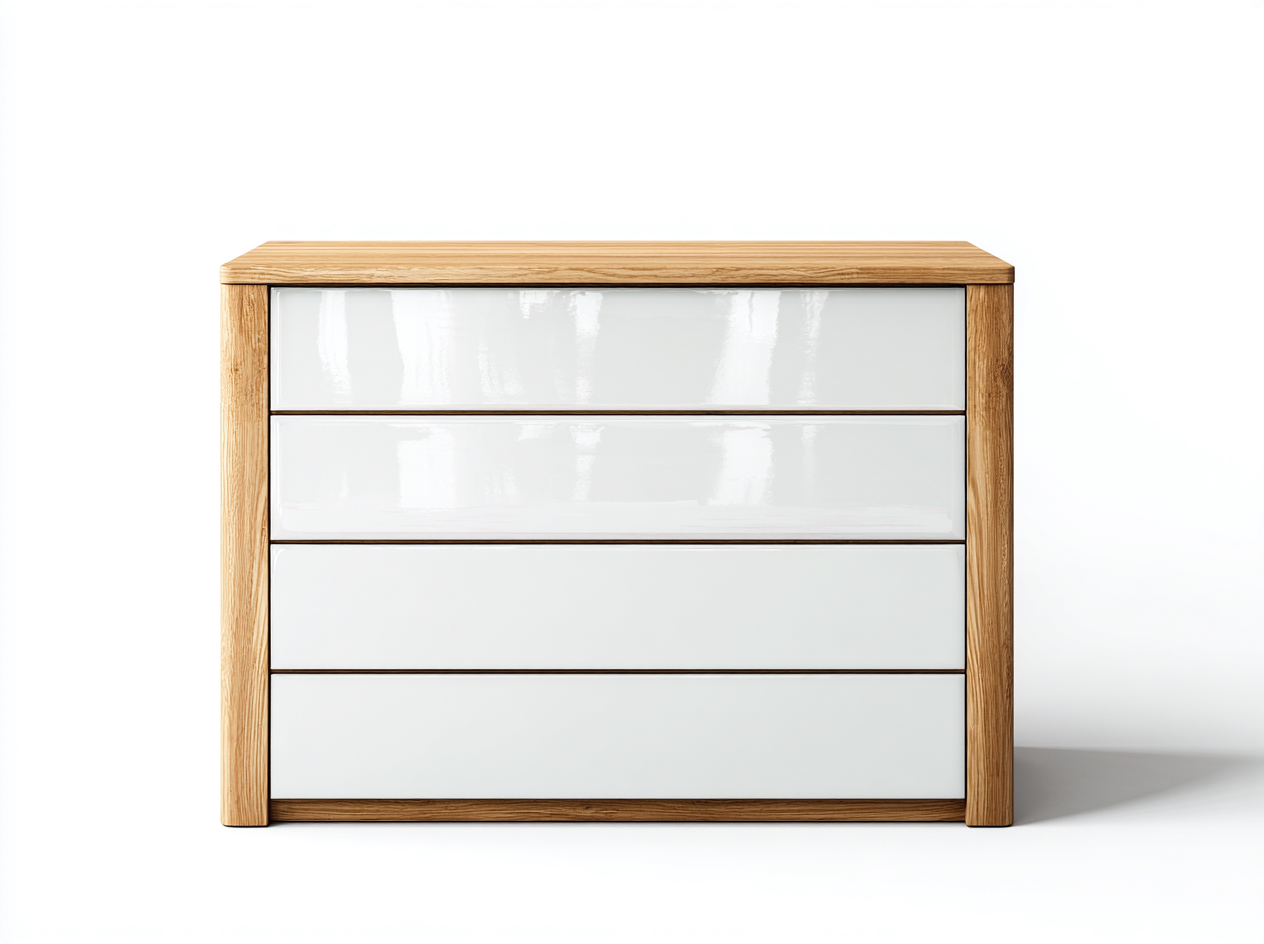 The structure is crafted from solid wood with a natural wood frame, combined with smooth white high-gloss drawer fronts. The contrast between warm wood tones and glossy surfaces highlights precise craftsmanship and modern aesthetics.